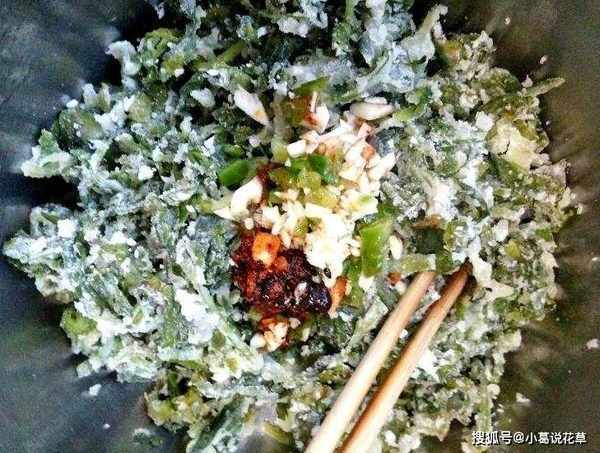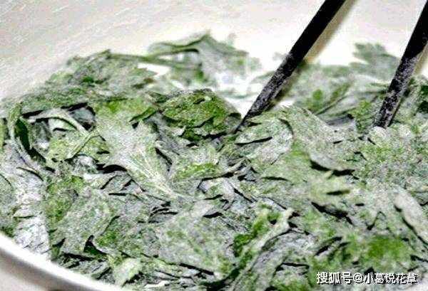 小貼士:做這步之前,一定要把芹菜葉裡的水全部洗幹凈,不然芹菜葉裡加入面粉後,面粉會結成小團子,很難去掉。