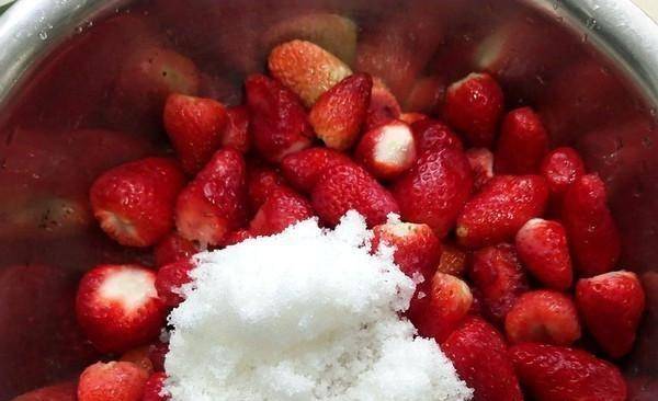 1.草莓去掉尾部的草莓疤,洗凈瀝幹水分加入白糖(草莓和白糖的比例為3:1)