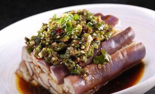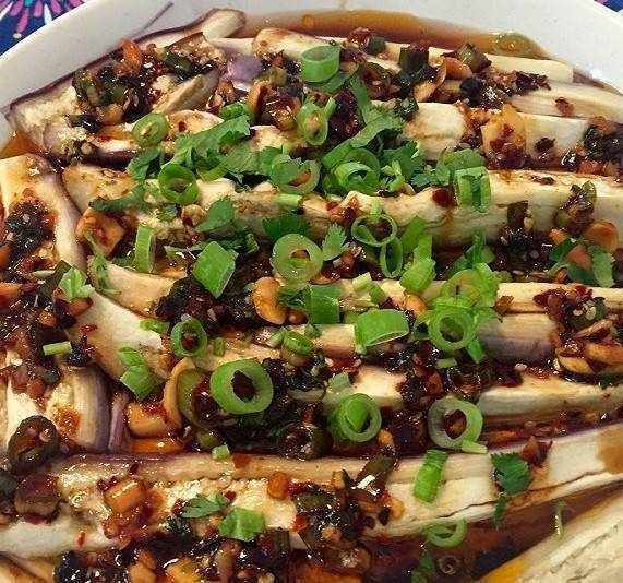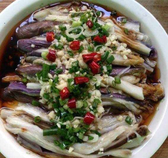 1、茄子洗凈不用去皮,然後切成粗條蒸好,取出備用!
