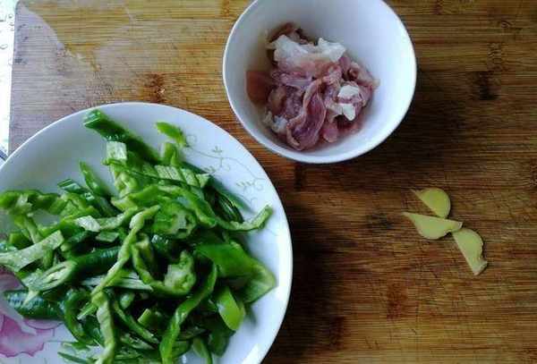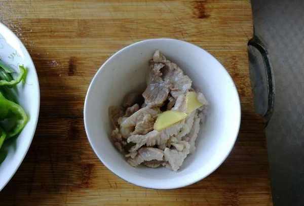 1.將肉絲洗凈放在小碗裡,瀝幹備用。將生薑切成三小片。青椒、辣椒去核,去籽,切成片。