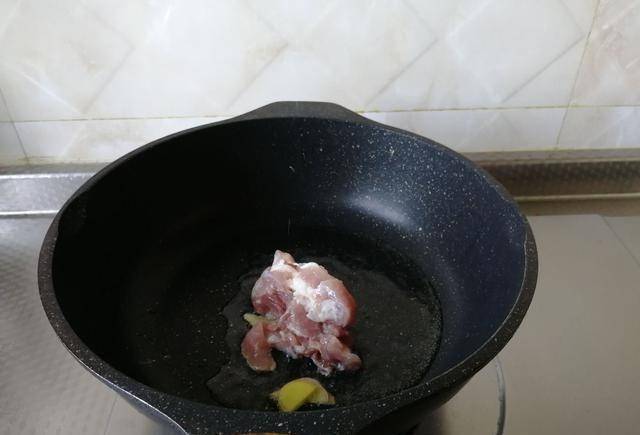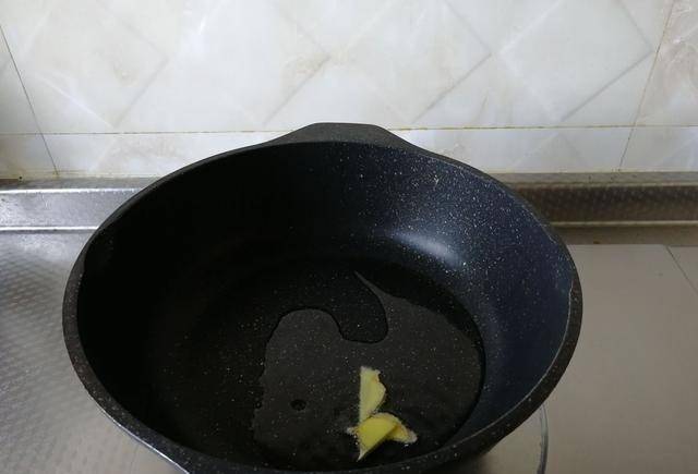 2、幹凈的不粘鍋倒入玉米油,大火燒熱油,加入薑片爆香。