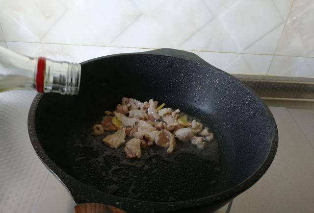 4、炒至肉絲變色熟透,倒入料酒去腥。
