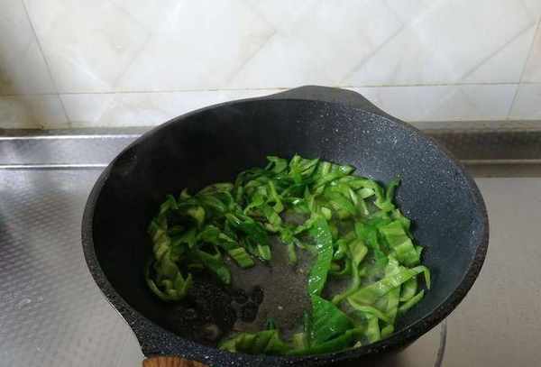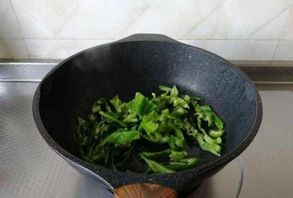 6、鍋內留底油。加熱,加入磨碎的青椒並開始攪拌。