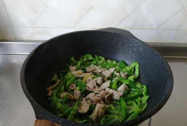 燈籠椒2個,辣椒1個,肉絲半碗,精鹽1-2勺,水半碗,雞精少許,玉米油25ml,薑3片,料酒5-8g