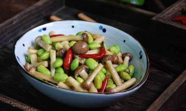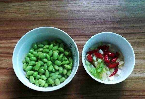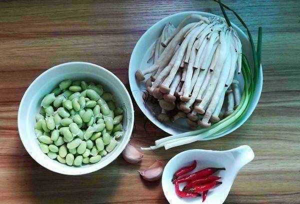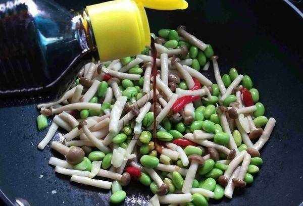 蟹味菇200克、毛豆150克、泡椒4個、大蔥3根、蒜2瓣、醬油1湯匙、精鹽適量、花生油適量