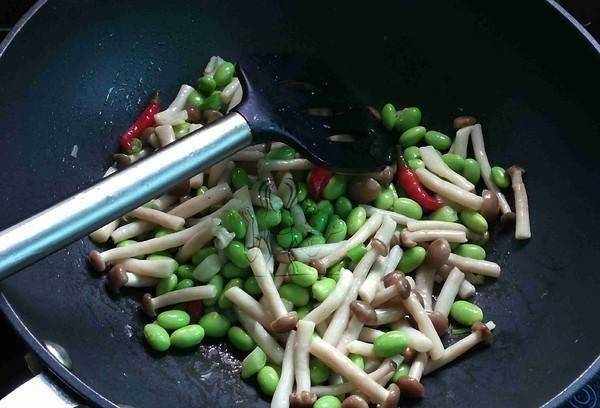 7.加入毛豆和蟹味菇翻炒