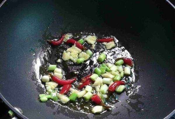 6.油鍋燒熱,下蔥、蒜、泡椒爆香