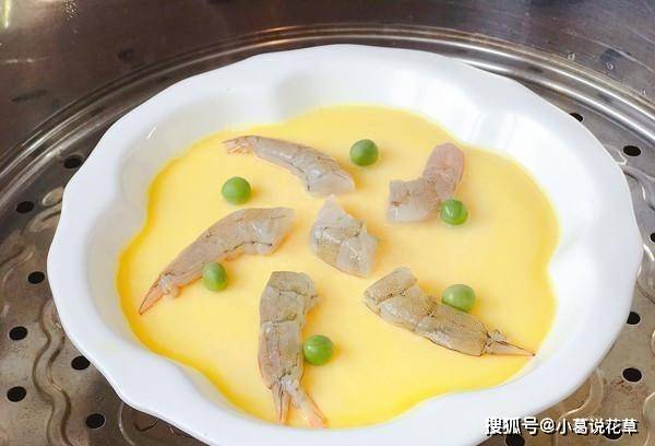 6.蛋羹蒸5分鐘後,打開蓋子。蛋液基本凝固。將準備好的蝦和熟青豌豆呈螺旋狀排列在蛋羹上。蝦太大瞭,所以我切掉瞭一部分,隻用瞭蝦尾。足夠的。排好的蝦和青豆有點像八卦陣,蓋上鍋蓋再蒸5分鐘。