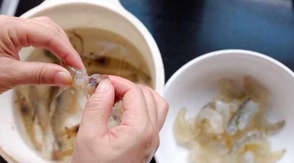 第一步:從市場上買來的鮮蝦去殼去頭,然後去蝦殼,去殼的蝦用清水清洗幹凈。
