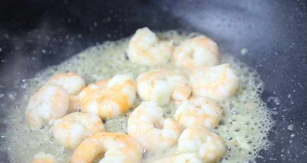 第五步:起鍋,加入少許油,油熱後,將蝦放入鍋中快速翻炒。蝦變色後撈出備用。