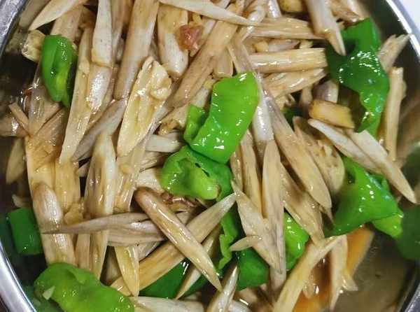 所有材料洗凈後,在鍋中倒入少許食用油。油溫高的話,先放蒜頭,再放蓮藕尖入鍋,加調料快速翻炒,加鹽和雞精,下青紅椒,翻炒直到食材碎爛可口,就可以直接出鍋瞭。