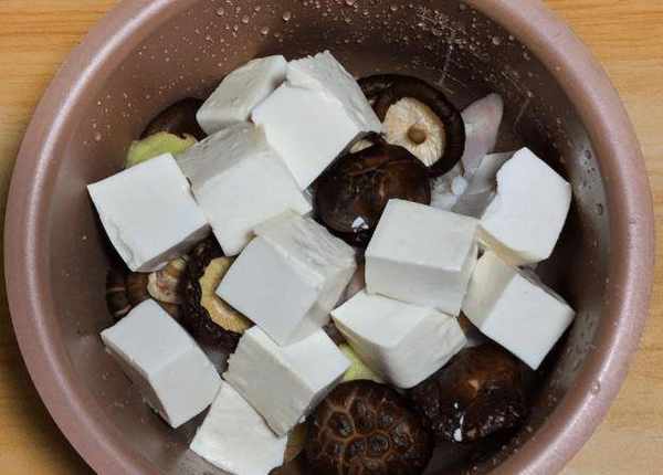首先準備好食材,豆腐一塊,香菇適量,青菜適量,鹽適量,食用油適量,五香粉適量。