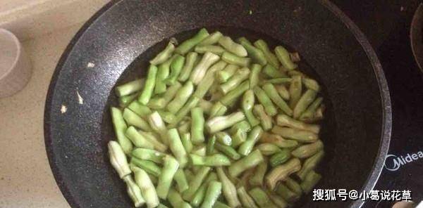 3、鍋燒熱,倒入油,放入蔥花炒香。倒入準備好的豆角翻炒片刻