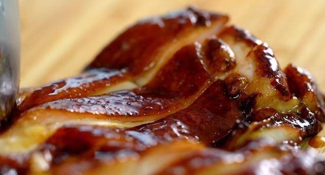 把雞肉從烤箱裡拿出來,在上面刷上醬汁。放回烤箱再烤5分鐘或直到煮熟。時間到瞭,我們把烤好的雞腿取出,切成小塊。外皮酥脆可口,雞肉鮮嫩多汁,超級好吃。