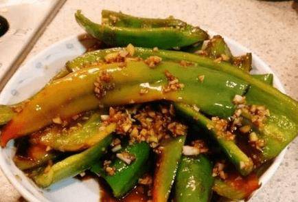 鍋裡放油燒熱,放入青椒,小火慢炒。煎的時候,用抹刀把青辣椒壓碎,直到表皮起皺、燒焦和腫脹。翻面煎另一面虎皮;