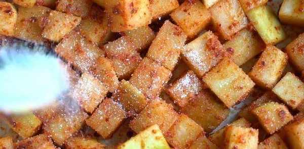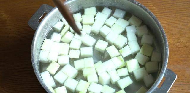 將白蘿卜洗凈去皮,切成約2.5厘米×2.5厘米的小塊,鍋中倒入1升水燒開,加鹽130克拌勻。水開後關火,加入蘿卜丁浸泡20分鐘。