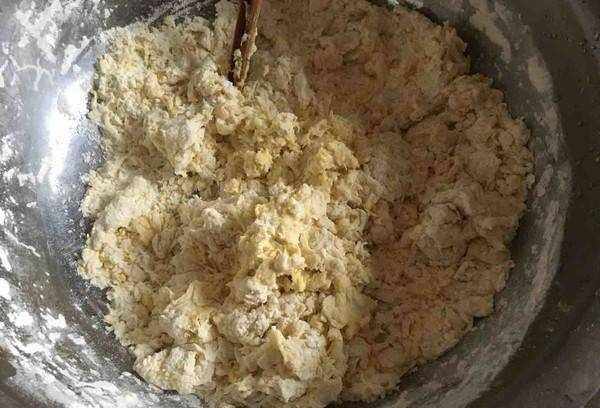 2、倒入清水時,用筷子攪拌成薄片狀;(面粉不斷吸水,建議多留些水;)