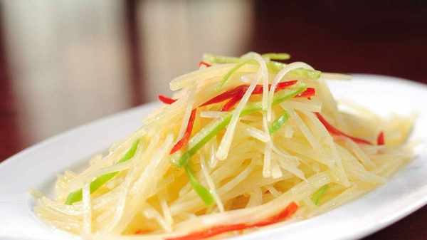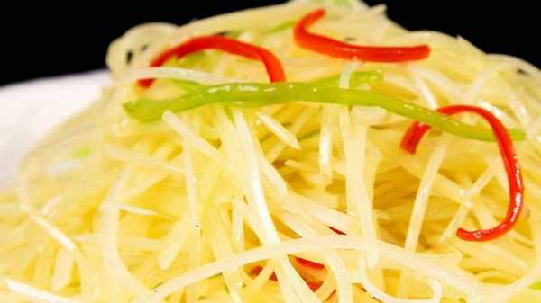 第五步:另起一鍋,燒熱鍋內倒入適量食用油,將之前泡好的薯片撈出瀝幹水分,放入鍋中用中火翻炒至斷生。然後我們把之前炒過的食材放入鍋中邊攪拌邊炒勻,然後在鍋中加入適量的食鹽、醋和味精,等到調料炒熟後關火,放入切碎的蔥。鍋裡再炒幾下,就可以上酸辣土豆片瞭。