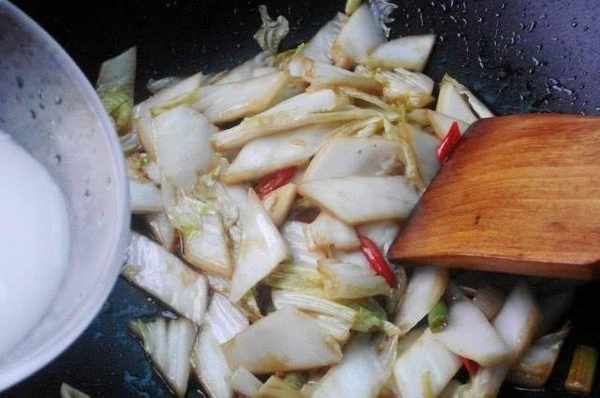 第五步:白菜葉炒好後繼續往鍋裡加入適量的食鹽和糖調味,最後順著鍋邊往鍋裡倒入少量的陳醋,快速翻炒,然後將其從鍋中取出。