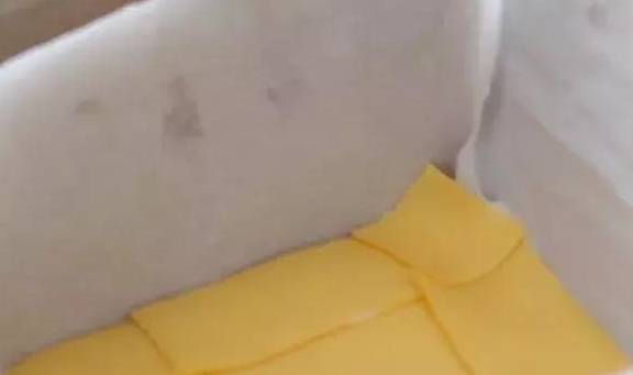 5.將五分之二漿料倒入模具中震平,均勻鋪上一層芝士片。