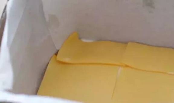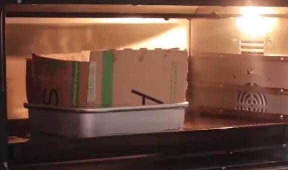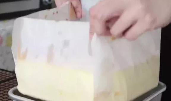 8寸方形烤盤中墊烘焙紙,四周可以墊厚紙片定型防止四周烤焦。