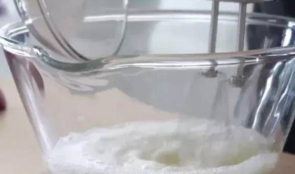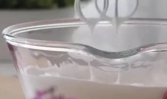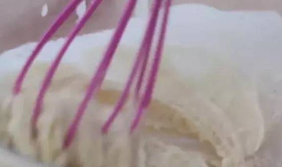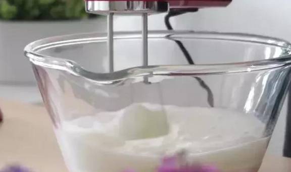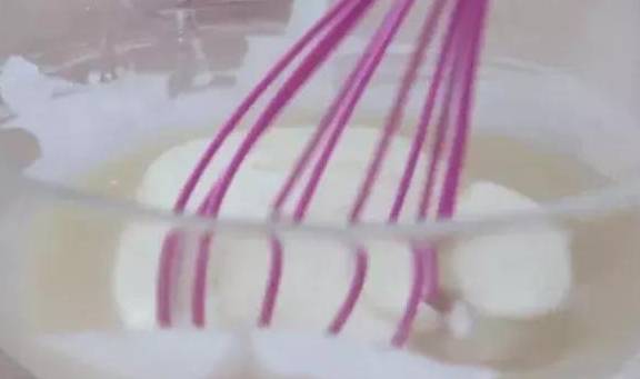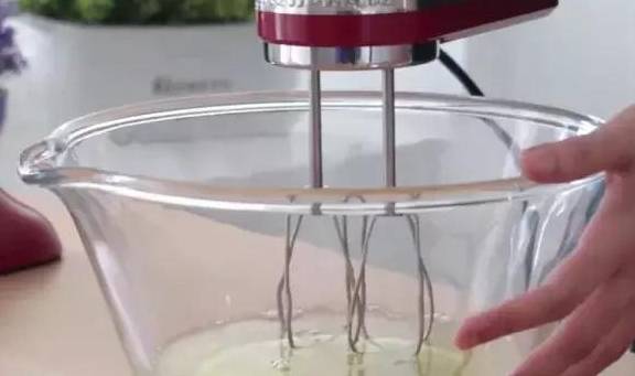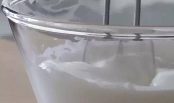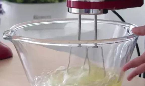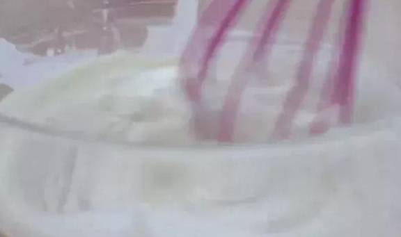 3.蛋清在幹凈無水無油的容器中打發至魚眼泡狀,分次加入幼砂糖打至8成尖角直立狀。