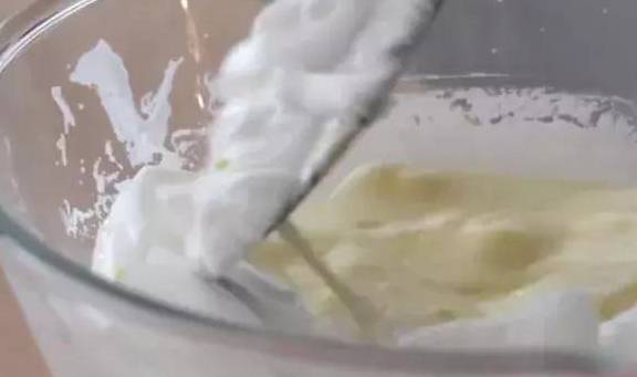 4.將三分之一打好的蛋白加入蛋黃漿料中翻拌均勻後,再全部倒入打發好的蛋白中翻拌均勻。
