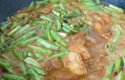 肉炒的差不多之後,我們要做的就是加進去一些菜瞭,我們傢最常用的就是長豆角,直接倒進肉裡面翻炒均勻,之後再倒入一些開水煮著,等到差不多熟的時候,把買來的熟面條,就是我們這裡特賣的蒸鹵面的面條放進去,拌一下!