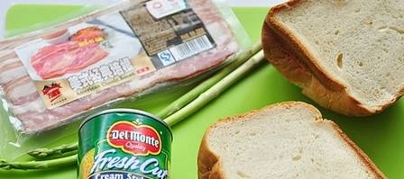 材料:湯種吐司1個,地捫玉米羹1瓶,培根4片,蘆筍2根,玉米油1小匙,清水150碗,鹽1/2小匙。