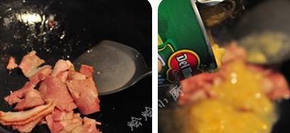 3、熱炒鍋,加入1小匙玉米油,倒入培根炒香。