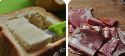 1、將湯種吐司切成兩半,然後沿著四邊切割,將吐司中心挖空。