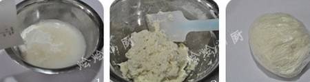 2、用橡皮刮刀或是筷子不停的攪拌,直到面粉成團。