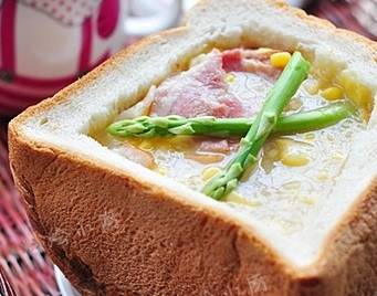 面包機烤出來的吐司外形不是很方正,不過用來做面包盅卻是很合適,今天就上一款玉米濃湯面包盅,將吐司的中間挖空,加入玉米濃湯和培根,就是能量滿滿的早餐噢!