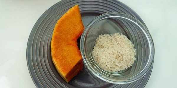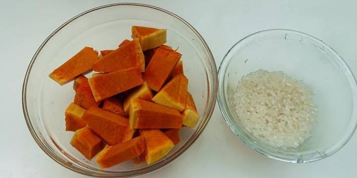 2.將南瓜去皮,切成小塊,香米洗凈。