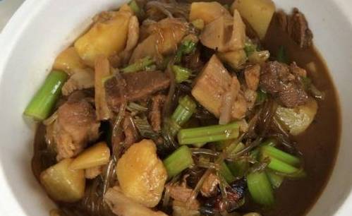 這款就有點東北亂燉瞭,裡面的原料相當的多,味道真心贊!土豆燉的特別糯,還很入味,就服這道簡單的叫不出名字的亂燉,好吃!還有一種媽媽的味道!表嫂說傢裡面沒有那麼多現成的東西,隨便做瞭一點,讓我不要嫌棄,這我哪敢,這麼好吃,我要怎麼昧著良心嫌棄啊?