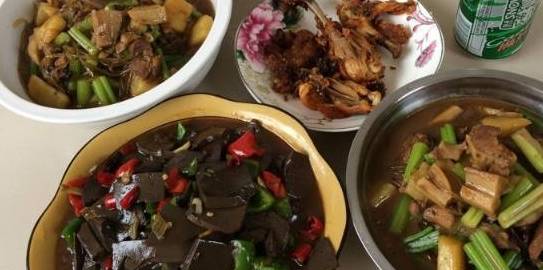 回到農村老傢辦點事兒,表哥熱情的邀請我去傢裡吃飯,再三推辭可是表哥熱情相邀,於是我就巴巴的去瞭,蠻不好意思的,還好表嫂做的都是傢常菜,沒有那麼隆重,這讓我自在瞭很多,雖說都是傢常菜,但是表嫂做的真的超級贊的,這是紅燒豬血,我自己做的時候,總是會碎,但是表嫂做的居然如此完整!