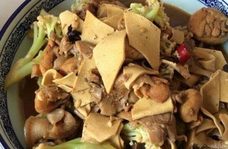 豆腐皮燉雞塊,裡面還加瞭有機花菜,很好吃,作為一個蹭飯者,我做到瞭從頭到尾狂吃狂吃……少說話多吃飯的節奏,一桌菜我自己就消滅瞭一大半!畢竟這麼好吃的菜,我回到城裡就沒有人做給我吃瞭,這傢常的味道就很好,不得不說,還是農村的飯菜好吃啊!