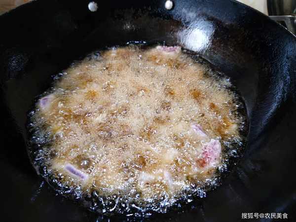 3.鍋中入油,油溫四成熱時把漿好的裡脊肉入鍋滑油,滑至肉塊變色浮起後撈出控油。