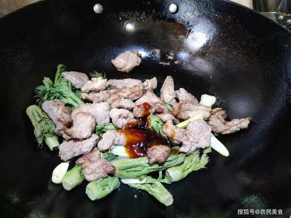 3.鍋中入油爆香蔥薑蒜,下入漿好的肉絲翻炒均勻,炒至肉絲變色後下入蕨菜段,加入鹽、蠔油和胡椒粉翻炒均勻,出鍋前滴幾滴藤椒油即可出鍋。