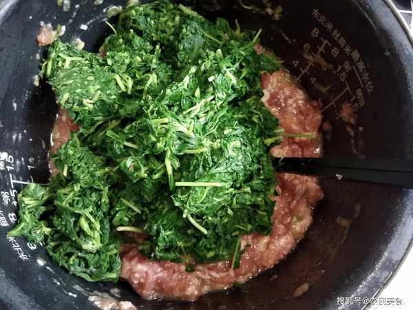 3.五花肉切成小丁,加入蔥薑末、鹽、一品鮮醬油、白糖少許、蠔油、胡椒粉和十三香攪拌均勻,然後分次打入清水至肉餡膨脹上勁,把攥幹水分的山麻楂加入。