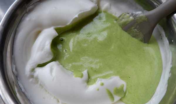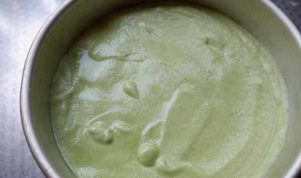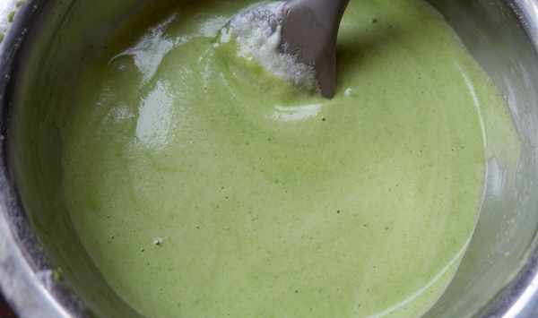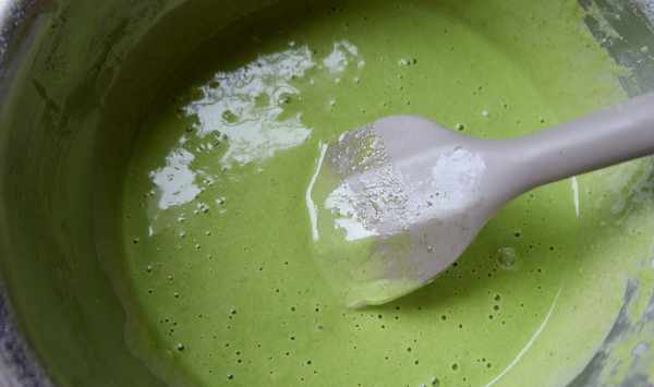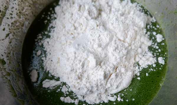 第六、把100克的蛋糕粉放入蛋黃和菠菜菜的液體中,攪拌均勻。
