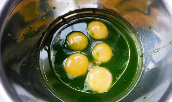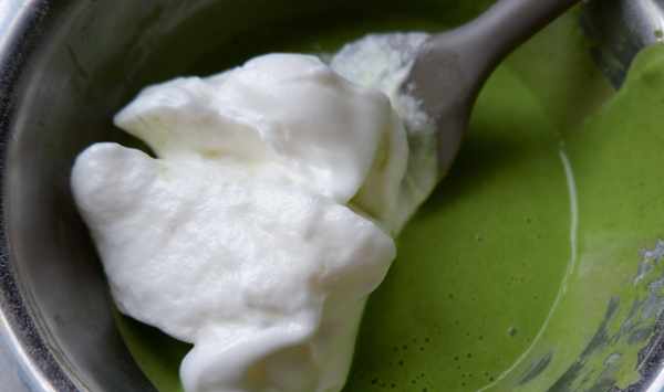 第三、把雞蛋的蛋清和蛋黃分離,蛋黃放入玉米油、菠菜汁、10克白糖中。