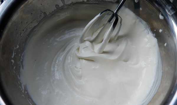 十六、250克的淡奶油加入十克的白糖,打發,然後把一部分的淡奶油放入裱花袋中備用。