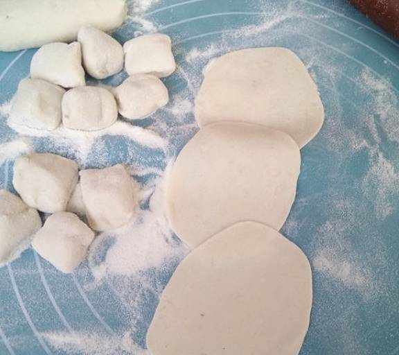 第7步、靜置好的面團做成大小適中的面劑,搟圓作煎餃皮。