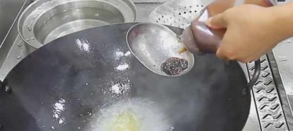 5、加入一點點的老抽,調一下底色,加入一勺白糖,一勺雞粉,一勺食鹽,食鹽不要放得太多,因為蠔油是咸的,如果為瞭吃原味,雞粉可以不放,繼續攪動,淋上少許水淀粉,湯汁粘稠以後,倒在盤中的生菜上面。