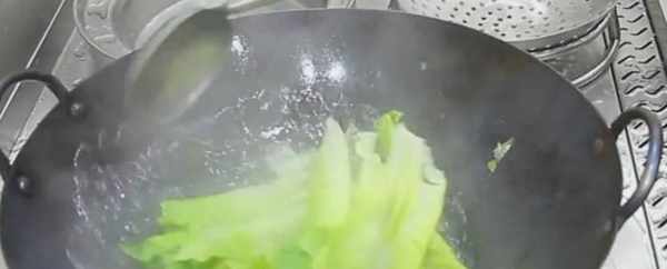 3、鍋中燒水,放入一勺食鹽,少量的植物油,這樣焯出來的生菜顏色翠綠鮮亮,水開以後倒入生菜,迅速翻勻,生菜葉由微黃轉為綠色,焯水10秒鐘,然後倒出生菜,控水備用。