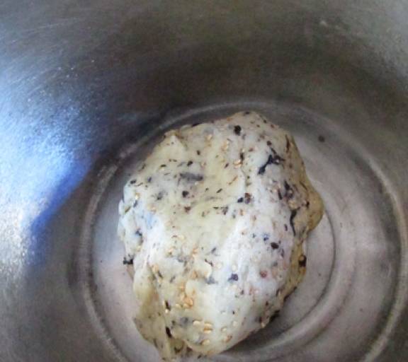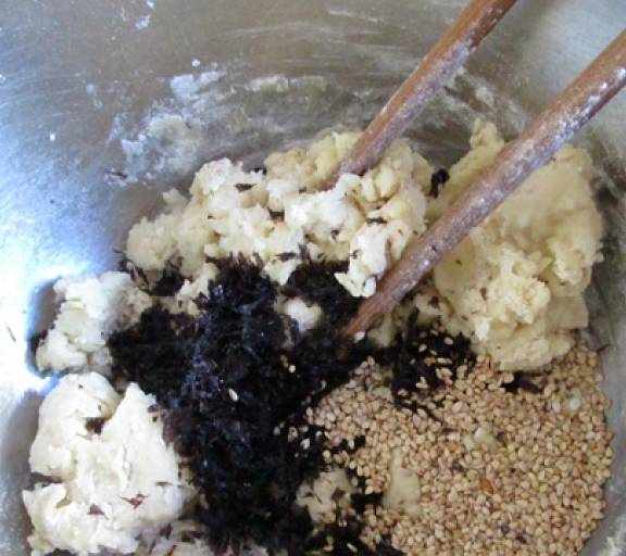 第3步、把小蘇打和面粉混合過篩,然後篩入第一步的液體中攪拌成面團,加入海苔碎和芝麻