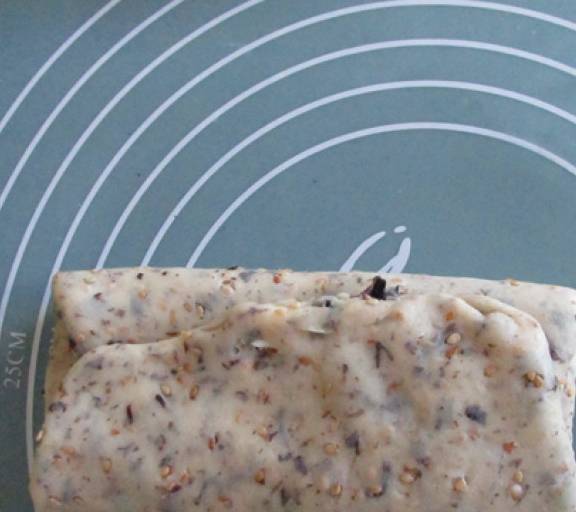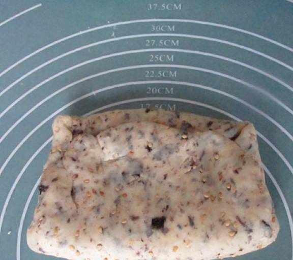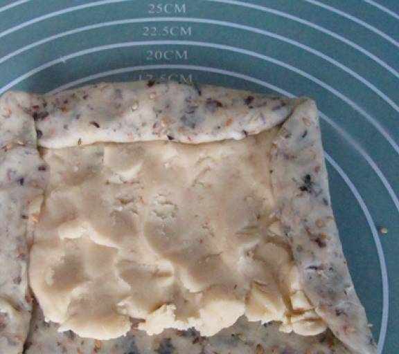第10步、用搟面杖壓開再搟,然後對折三折,餳十分鐘後再重復疊一次被子。共疊3次