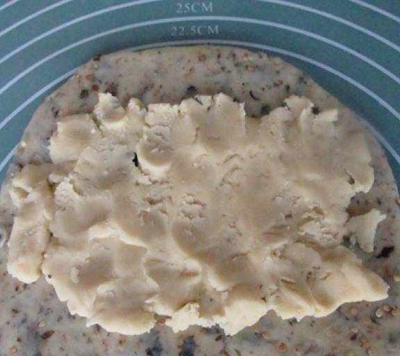 第7步、把餳好的面團搟開,鋪上油酥