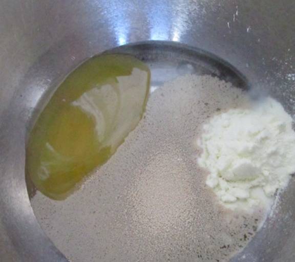第1步、把水油皮的用料:面粉、奶粉、酵母粉,鹽和融化的黃油、全部放入盆裡